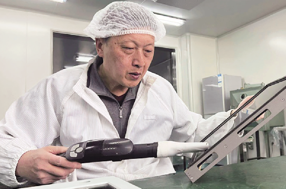 军用设备要在恶劣环境下使用,对产品密封性要求非常高。显示屏周边溜胶密封是很关键的工序,如果做不好,产品外观和质量都会受影响。优秀的点胶人员通常就是根据经验结合出胶量,控制手劲,落的胶又稳又匀,一气呵成,非常美观。王春鸿根据多年经验,对操作流程进行改进,提出了采取立式溜胶方法,同时严格控制次数、手法和时间,降低了加工难度,就是新员工也能很快上手。
