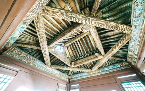 这座重达数十吨的3层寺庙孤独地悬挂在半空,似乎只有几十根立木支撑整个楼体,这是因为起主要支撑作用的并不是这些立木,而是深深插入岩石的横梁。北魏时期的工匠们利用简陋的工具,在岩壁上打出两米多深的石孔,然后将27根直径50厘米的横梁一根根插入石孔,横梁的大部分都在石孔内,露在外面的横梁只有1米。这就形成了一个强有力的杠杆,轻松地挑起了悬空寺的绝大部分重量。工匠在这些露在外面的横梁上铺上走廊,通过绳索将建筑材料运上90米的高空,最终组装出一个壮丽的悬空寺。